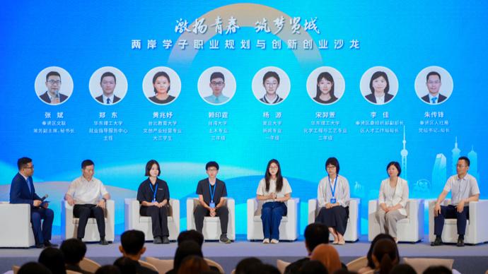 現場向研習營臺灣大學生代表授旗。活動現場以短視頻的方式介紹了研習營整體情況。在主題沙龍環節,來自兩岸高校的大學生代表圍繞“職業規劃與創新創業”主題,結合各自專業進行交流發言。區人才局、區人社局以及華東理工大學就業指導老師詳細解答了兩岸學子的問題,介紹了人才優惠政策和創業就業具體路徑。