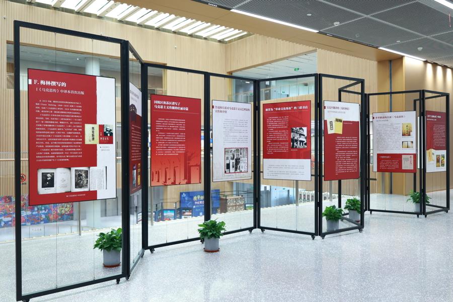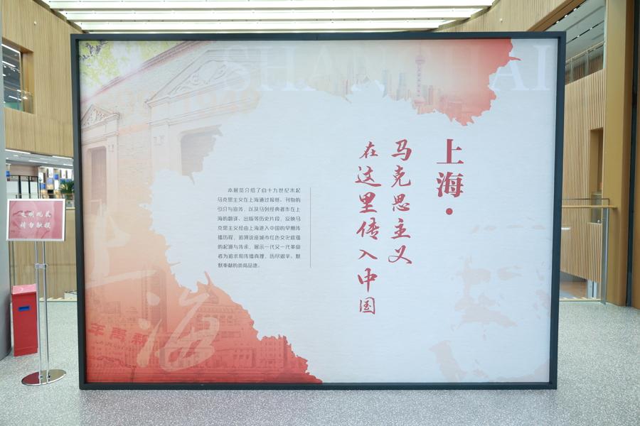 上圖東館六樓上海社會科學館中庭展出“上海:馬克思主義在這裏傳入中國”展,介紹自19世紀末起馬克思主義在上海通過報紙、刊物引介、宣傳,以及馬列經典著作在上海翻譯、出版的歷史片段,反映馬克思主義經由上海進入中國的早期傳播歷程,追溯這座城市紅色文化底蘊的起源與傳承,展示一代代革命者如何追求和傳播真理。
