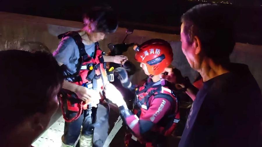 消防救援人員經觀察瞭解情況後,立即制定施救方案,火速開展救援行動,將車上的3節伸縮梯艱難拼接起來,架在礁石和灘塗高地之間。兩名消防員繫好安全繩,頂着水流的衝擊,蹚過深水溝,在梯子兩端穩住身形,形成“橋樑”。