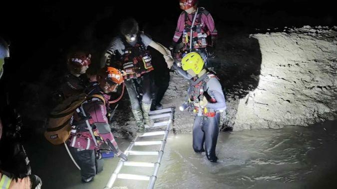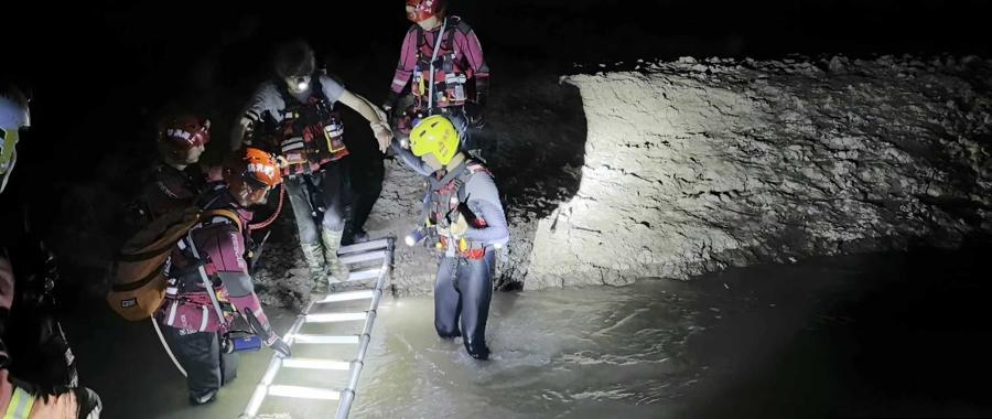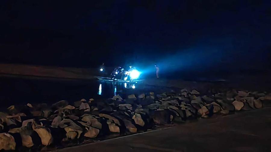 救援人員抵達時,天色已暗,渾濁的江水順着灘塗溝壑快速蔓延。兩位老人蜷縮在一小塊僅存的灘塗高地上,腳下的淤泥在不斷下陷,前方深水溝的水流已沒過膝蓋,且水流湍急,有不斷上漲態勢,情況異常危急。