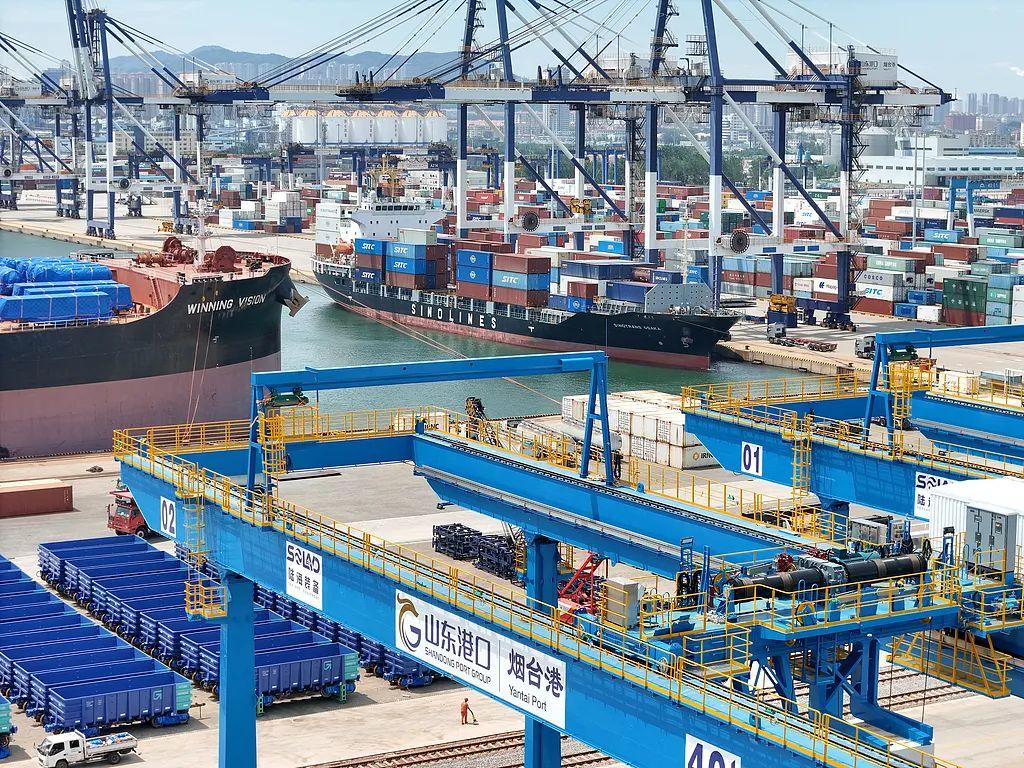 7月14日,出口貨物在山東港口煙臺港裝船