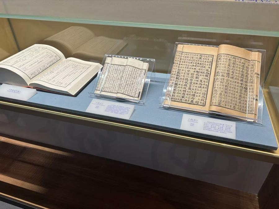 展覽從左至右分別展出的《甲骨文字典》《史記》影印本、《尚書》影印本。