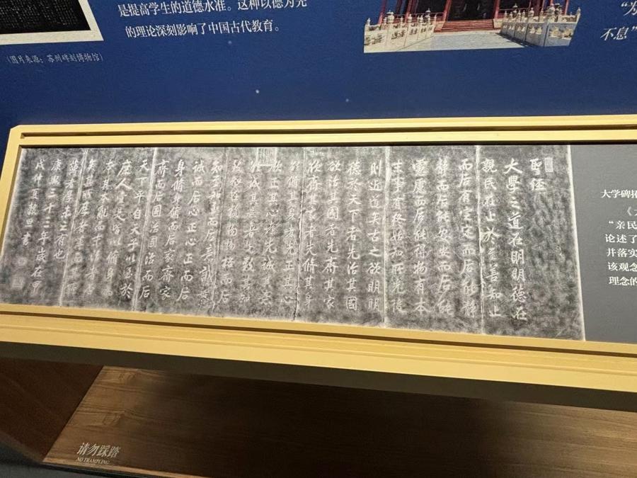 不論是上古時期官德思想的萌發,還是漢代“獨尊儒術”後形成的“德治”理論體系,均通過展品得以具象化呈現。例如,展出的《尚書》影印本中關於“爲官九德”的記載,印證了早期統治者對德行的重視;展出的《大學》碑拓片中關於“明明德”“親民”和“止於至善”的論述,體現了官德思想中的家國情懷和愛國理念。