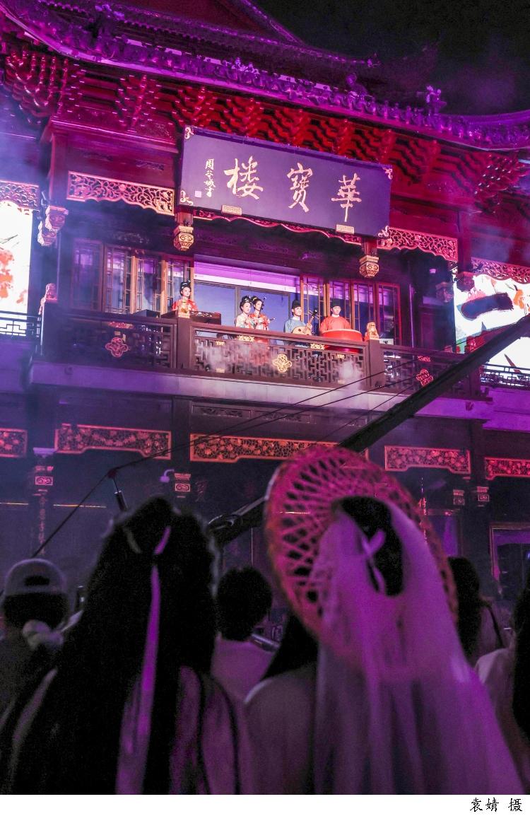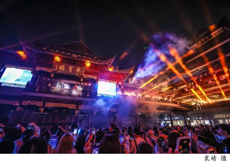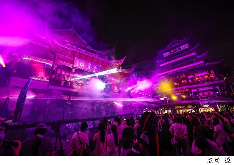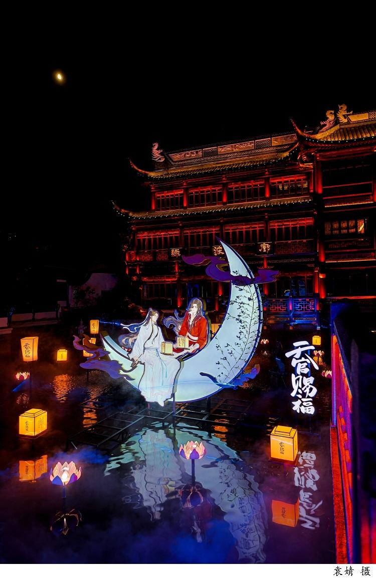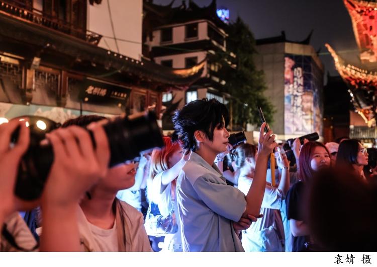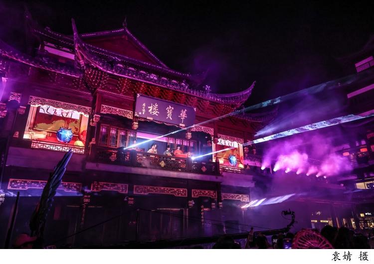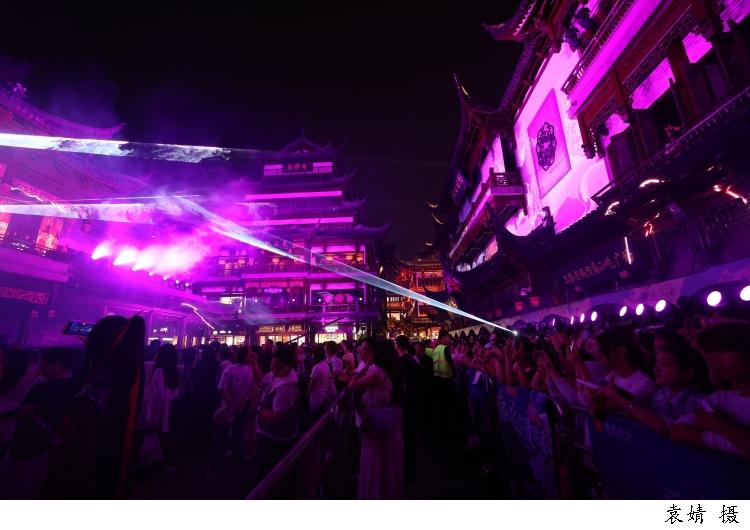 當晚,記者踏入豫園商城2號門,現場宛如啓動了次元穿梭的開關。被譽爲“中式浪漫天花板”的凝暉路,被精心還原爲動畫《天官賜福》中的極樂坊。豫園老街與《時光代理人》以“時光穿梭”爲紐帶,將動畫敘事與現實空間緊密縫合。九曲橋畔,《百妖譜》的百夭桃樹、《牧神記》的大墟祕境、《霧山五行》的潑墨山水與《天官賜福》的明燈三千在激光霧森中流轉成靈動畫卷,締造出令人屏息的東方幻想世界。