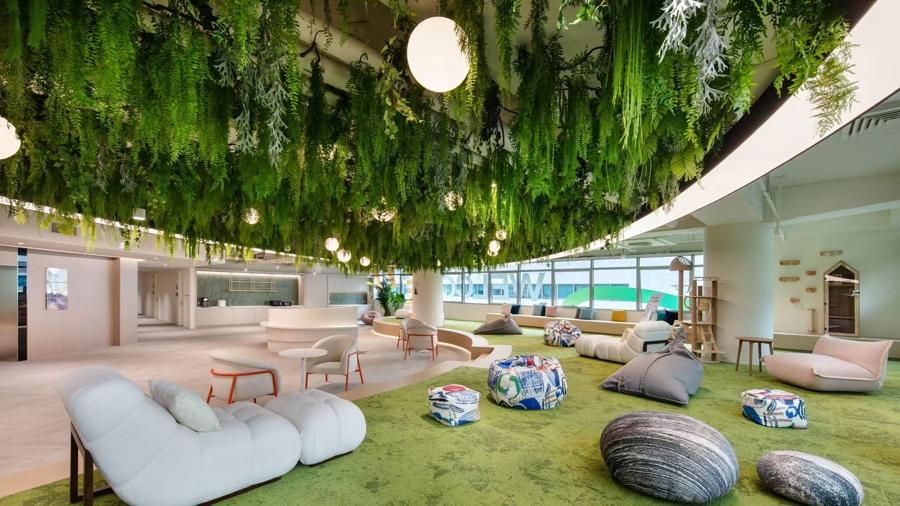V聚場以層次分明、功能聚焦的空間設計,系統賦能內容創作生態。不同樓層還有特別命名。一樓“希望之花”作爲能量補給站,爲創作者提供基礎保障,緩解疲勞。二樓“靈感雨林”則化身爲創意碰撞與孵化的核心引擎,這裏不僅配備瑜伽健身空間等設施,更通過開放式佈局、互動鞦韆、盎然綠植等元素,營造出自由交流、激發靈感的柔性場域。三樓“繽紛果園”進一步構建產業融合的共生平臺,特色貓吧等設施提升了生活感和趣味性。