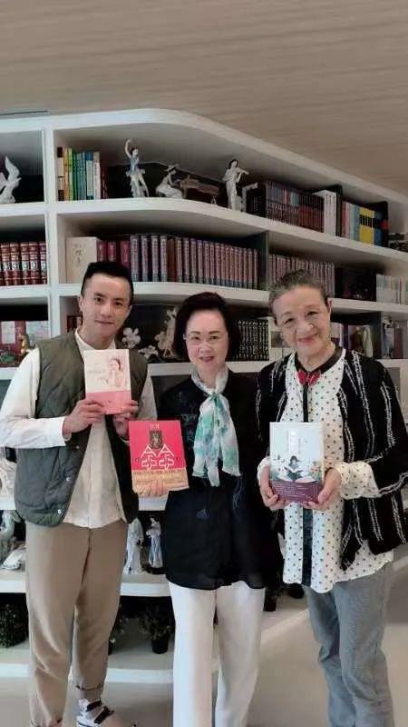 我班門弄斧地送給瓊瑤姐我寫的《回望》《念念》兩本書,她早就簽字準備好了,送給我和你她的著作《我的故事》《瓊章瑤句》。然後我們各自捧着書,站在整齊排放瓊瑤姐精裝出版過的書籍和稿件書架前,請她的祕書給我們留影(下圖)。