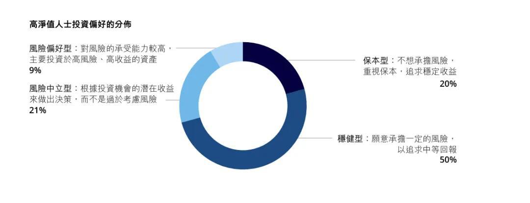在投資偏好方面,20%的高淨值人羣選擇了保本型產品,他們不想承擔風險,重視保本,追求穩定收益;50%選擇了穩健性投資,他們願意承擔一定風險,以追求中等回報;僅有30%的高淨值人羣願意承受較高的風險來換取高收益。