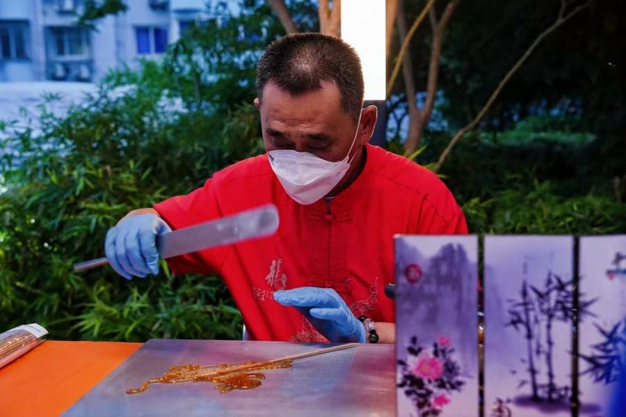 非遺糖畫製作、小丑互動、AI照片打印等鄰里角的攤位前排起了長隊,在這裏居民們隨意交流,享受集市帶來的樂趣,也在互動中感受到了一份誠摯的鄰里情。小朋友們拿起氣球在場地上嬉笑着,感受着晚風拂過的夏日夜晚;一幅幅生動的糖畫在專業藝人的描繪下徐徐出爐,無論是大人還是小孩都能在這裏喚醒心中的那份童趣;AI照片打印還原了老照片的歷史感,看着打印出來的照片,居民周阿姨感慨:“這個照片是我二十多年前拍的,時間久了都有點不清晰了,現在技術是真發達了,幫我AI修復一下,看起來和當年拍的一模一樣了。”