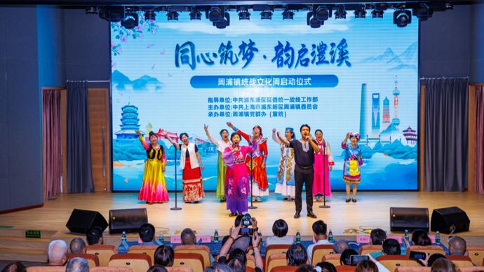 啓動儀式後,“聚聲・同心築夢” 文藝演出精彩上演。民族團結進步協會成員演唱的《家在上海》道出了異鄉人的歸屬感;各民族同胞用《太陽姑娘》《科爾沁民歌》等舞蹈,展示濃郁民族風情;江南絲竹樂團演繹的非遺文化,奏響古鎮雅韻;而孩子們傳遞出少年強則中國強的青春擔當;老來客器樂合奏與老年大學的合唱,則用旋律編織出跨越年齡與地域的同心紐帶。
