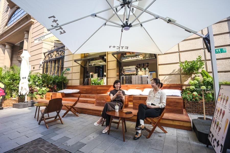 FTC+1的外擺位走木質風,應季綠植是天然的隔檔。從街對面看過來,這片空間既通透又富有層次感,盛得住好故事的發生。
