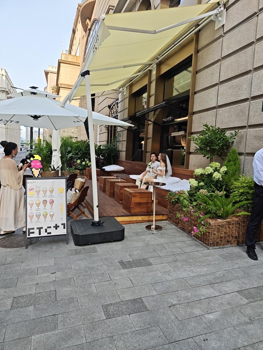 座位有了,故事也就來了。陳萌手機裏,保存了很多外擺位上的照片。這個向市民遊客開放共享的空間,有新人來拍婚紗照,也有外賣小哥、環衛工人歇歇腳,外地遊客走過路過也忍不住駐足。