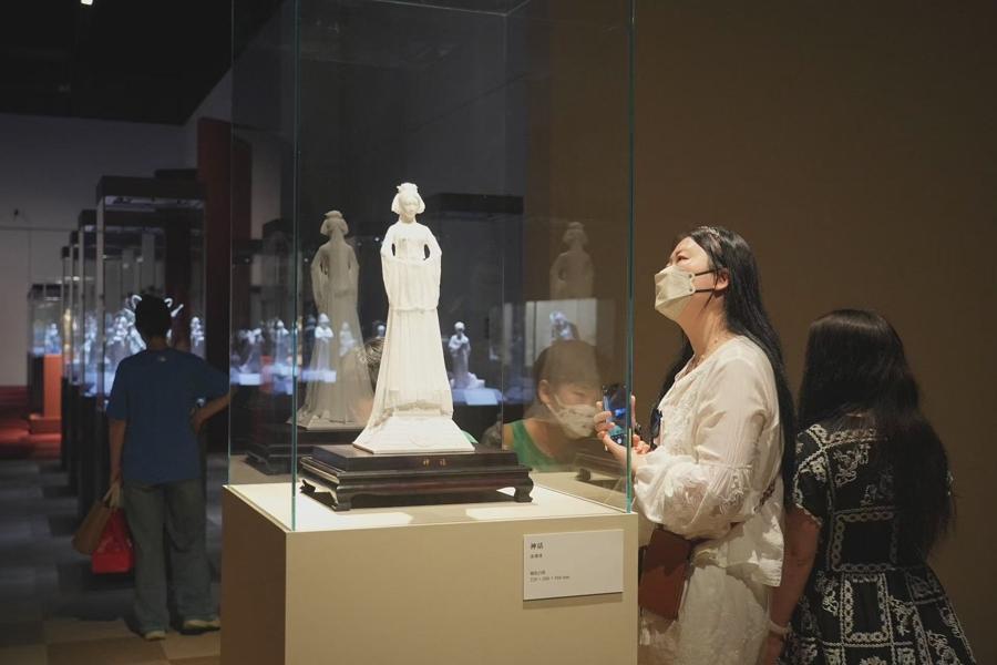 華東師範大學美術學院院長、展覽策展人張曉凌告訴記者,千年古縣德化,早在3700年前的夏商時期就開始了青瓷的燒造。至宋元時期,瑩潤如玉的白瓷漸成大勢,一躍而成爲海上絲綢之路交流的珍寶。明代法國人感慨於德化白瓷的冰心玉之美,將其稱爲“中國白”。此次展覽聚焦的,卻更是德化白瓷在當下的守正創新、與時俱進,如何在燒造與瓷雕技術方面自成一體,成爲中國工藝與非物質文化遺產體系中出衆的存在。
