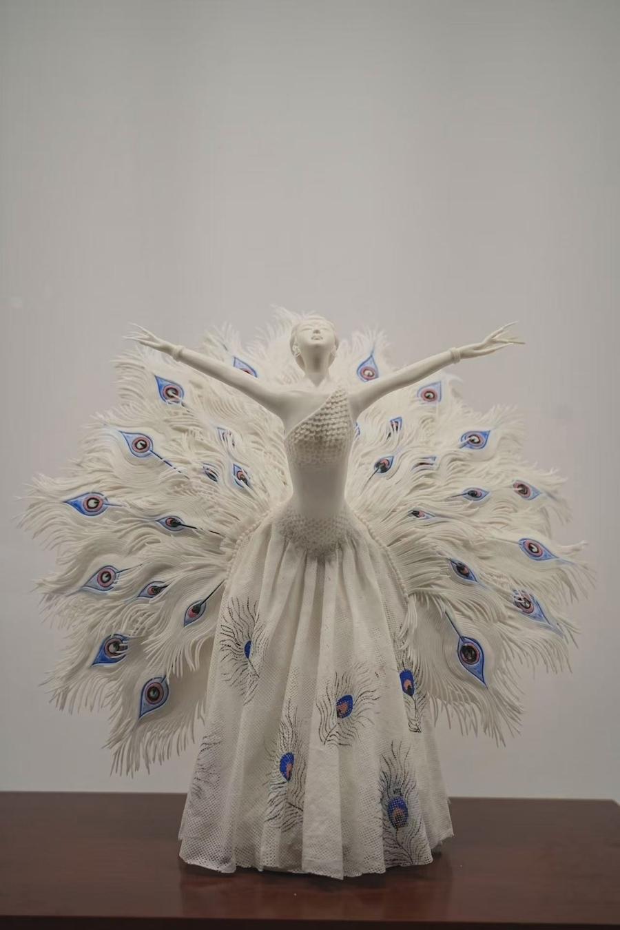 展覽現場,《神話》塑造的玉漱公主瓷骨仙姿翩然獨立,享受“單間”待遇,最是引得觀衆挪不開眼睛。只見她在燈光下白中透紅,透着獨特的溫度,任光影在蟬翼般的衣袂間遊走,獨具東方美學韻味。據其創作者連德理透露,作品從制胎到燒成花了六七年,歷經上百次失敗。“創作時得不斷調整瓷土配比、控制窯溫,既需要精益求精的技藝,有時也帶點一些運氣。”他坦言最終運用自主研發的“高韌薄胎瓷衣技藝”,成功將瓷衣厚度控制在0.2毫米,讓堅硬陶瓷化作繞指柔紗,“希望上海的朋友們能感受到白瓷的這份靈動”。