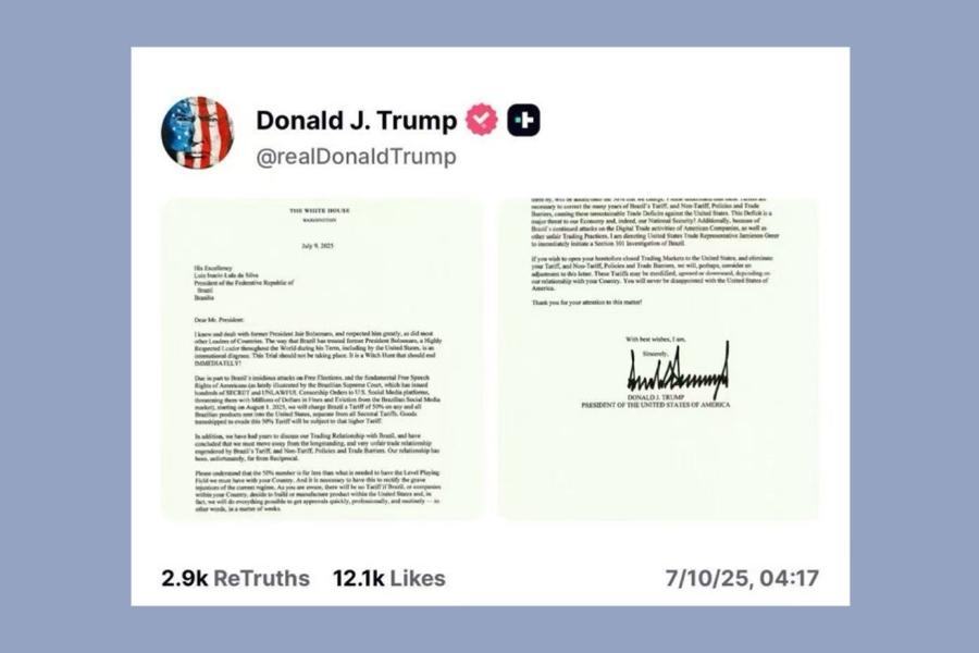 特朗普在社交平臺發佈致盧拉的信,信中威脅對巴西加徵50%關稅 圖源新華社