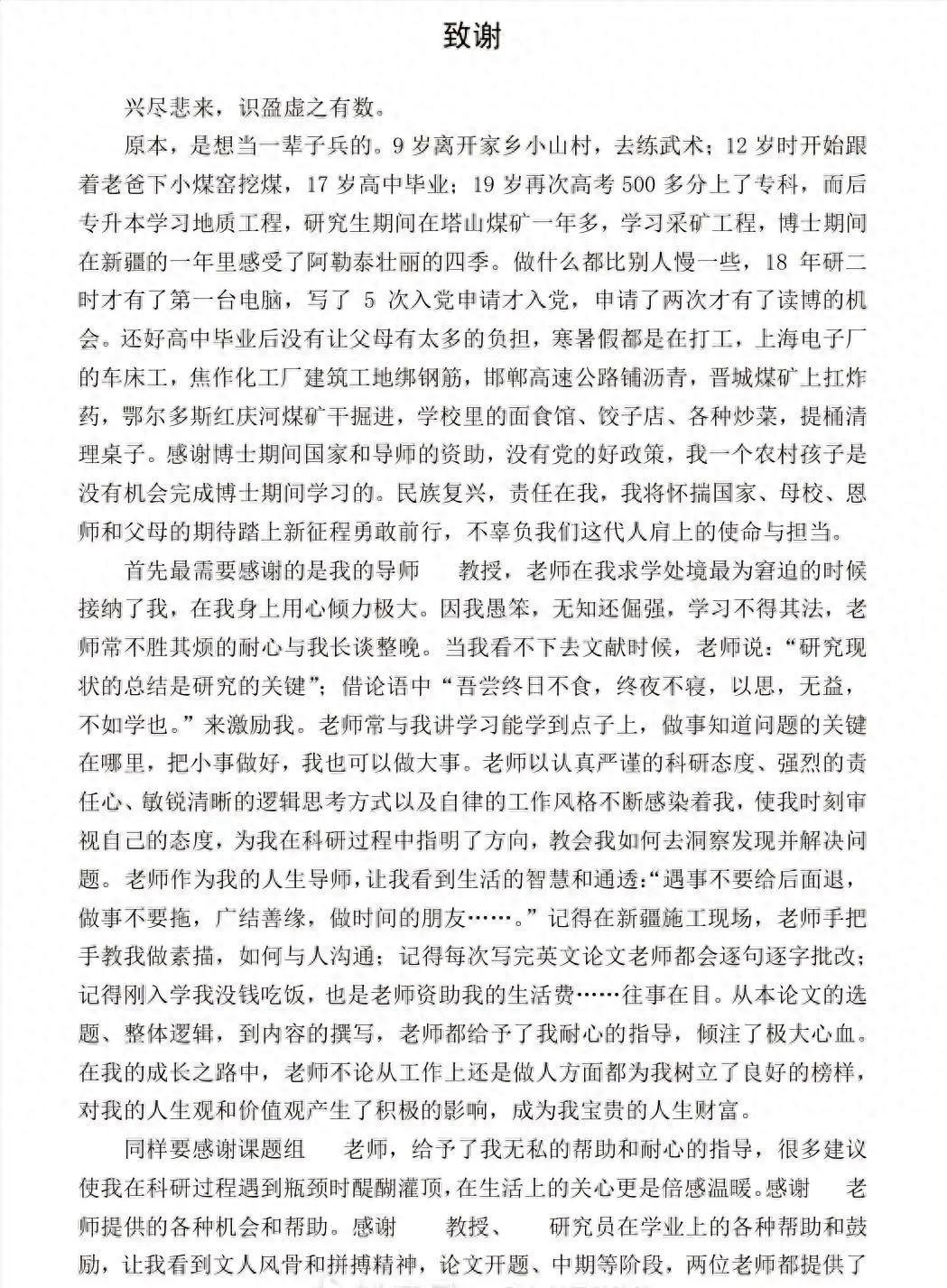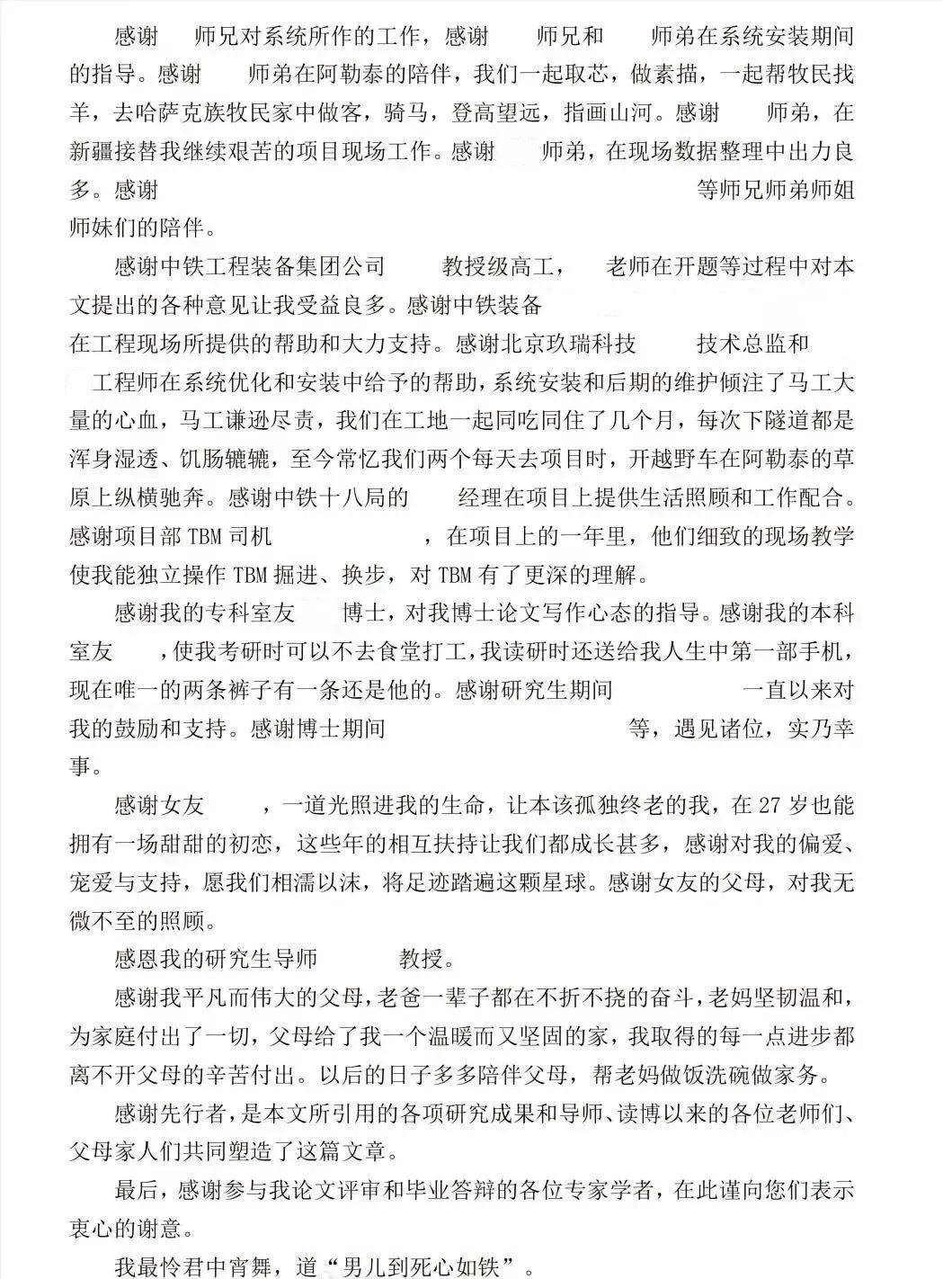 這篇致謝中,沒有華麗的辭藻。作者感謝了導師、課題組老師、師兄師弟師姐師妹,還有中鐵工程裝備公司、北京玖瑞科技、中鐵十八局的一衆員工,還有專科、本科室友及女友,還特別提到,本科室友對他進行了資助,“使我考研時可以不去食堂打工,讀研時還送給我人生中第一部手機,現在唯一的兩條褲子有一條還是他的。”