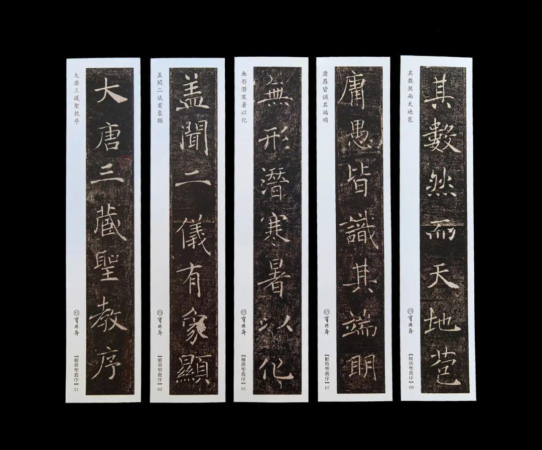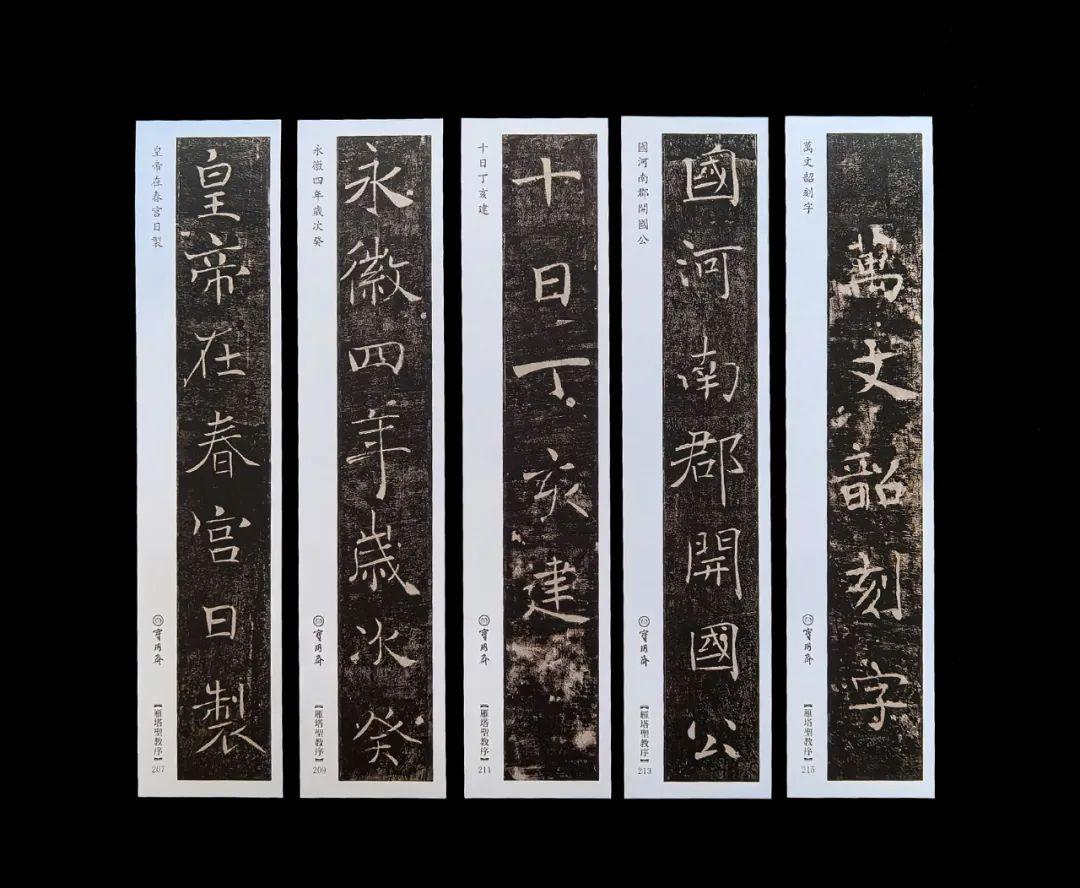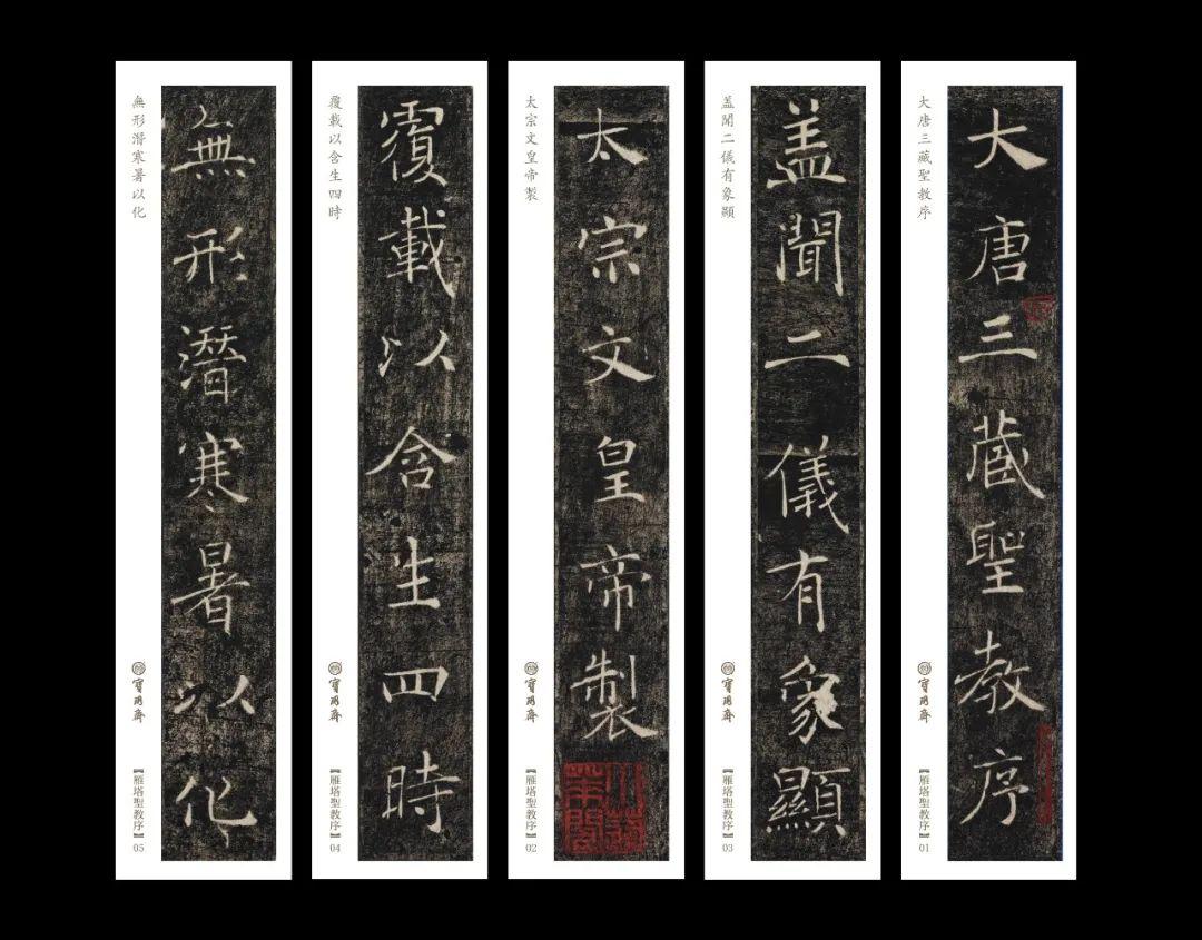 《雁塔聖教序》 碑高三三七▪五釐米,碑身上寬八十六釐米,下寬一百釐米,上碑爲序碑,全稱《大唐三藏聖教序》,位於大雁塔底層南面券門西側磚龕內,是唐太宗李世民爲玄奘新譯佛經所撰的序文,碑文二十一行,滿行四十二字,從右而左寫刻;下碑爲序記碑,全稱《大唐皇帝述三藏聖教序記》,位於大雁塔底層南面券門東側磚龕內,由太子李治,即唐高宗撰文,碑文二十行,滿行四十字,從左向而右寫刻,。兩碑共有一四六三字,均由褚遂良書寫,刻石者爲萬文韶。