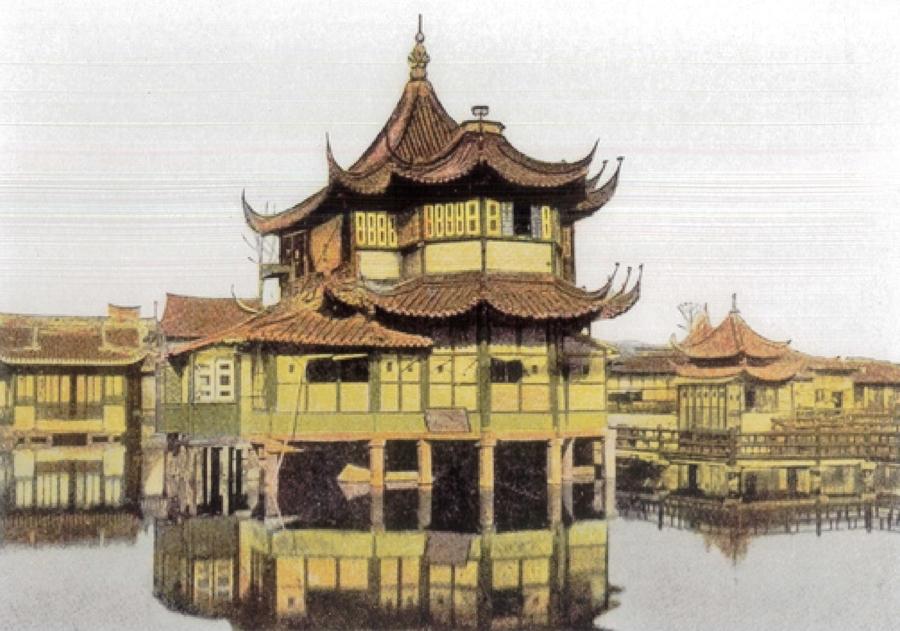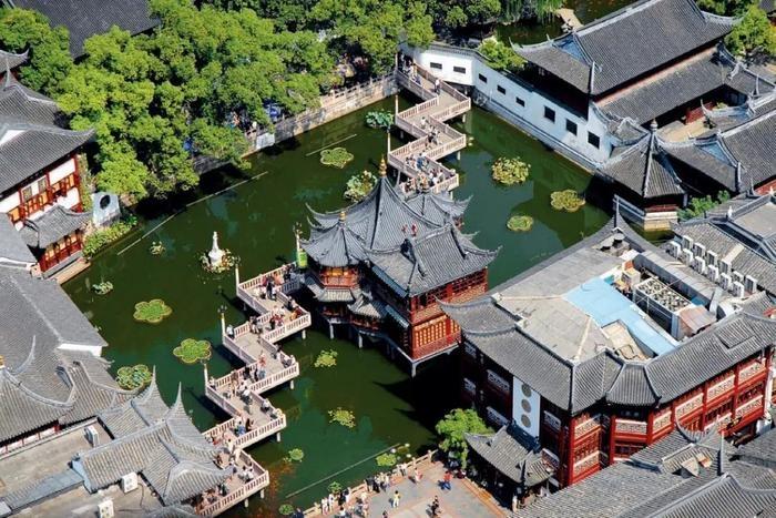 乾隆四十九年(1784年),布商集資改建“湖心亭”,立於碧水中央,成爲上海最早的商業會館。兩江總督陶澍讚歎其“疊煙千層石在水,野笛一聲人過橋”的勝景,由此,這座城市誕生了文化地標。三十一年後,當湖心亭化身“也是軒”茶樓時,它已成爲不折不扣的“海上第一茶樓”。