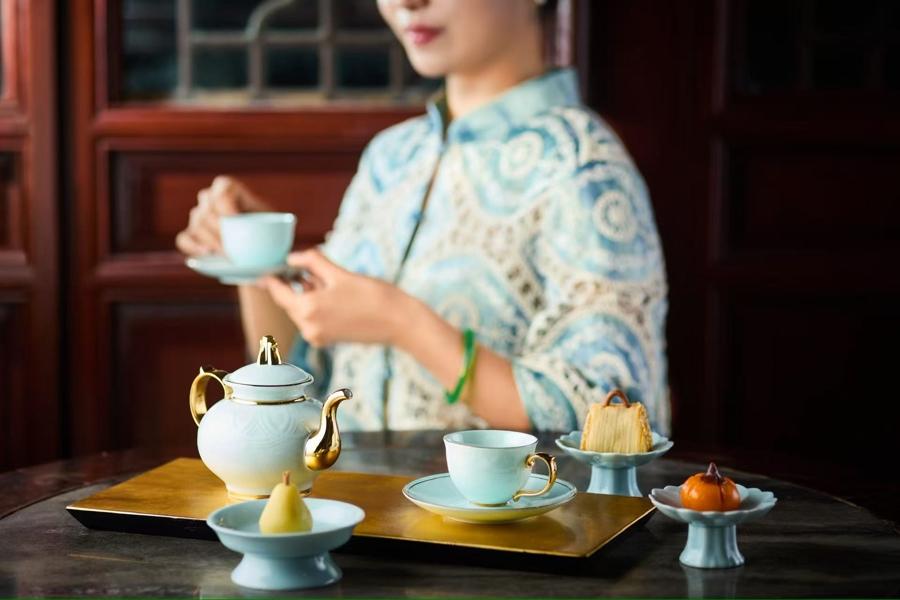 登上二樓,時光陡然深邃。作爲1990年上海首支茶藝表演隊的誕生地,如今“雙非遺”雅集在此綻放:非遺大師手製茶品,在茶藝師行雲流水的演繹中甦醒。英女王曾讚歎的“女王套餐”脫胎換骨,綠波廊九宮格點心的精髓凝練於方寸之間。“頂流下午茶應出自中式茶點——華流即頂流。”戎新宇希望以此重塑味覺審美。