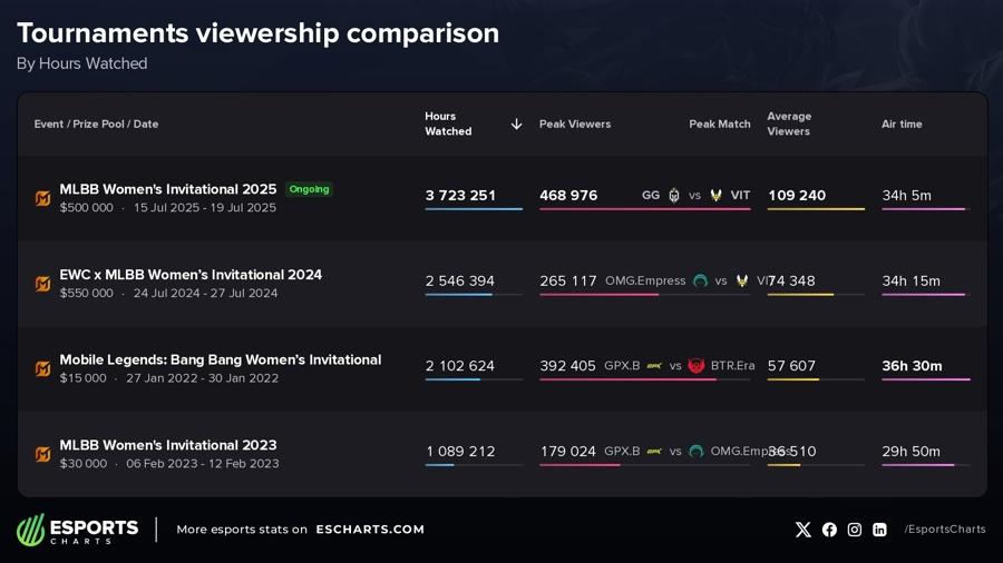 根據電競數據權威平臺Esports Charts統計,本屆《決勝巔峯》國際女子邀請賽峯值在線觀看人數高達468976人,刷新該賽事歷史收視紀錄。無論對賽事本身還是整個女子電競生態而言,本屆MWI都是一座重要里程碑。賽事以46.2%的同比增長率創下該系列賽事歷史收視新高,不僅成爲2025年上半年收視最高的女子電競賽事,更躋身全球女子電競賽事收視前五名。