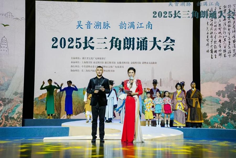 7月20日,由浙江省文化廣電和旅遊廳主辦,上海圖書館、南京圖書館、浙江圖書館、安徽省圖書館、金陵圖書館及諸暨市人民政府聯合承辦的“吳音溯脈 韻滿江南”2025長三角朗誦大會在諸暨市西施大劇院開幕。來自長三角三省一市的文旅界領導、朗誦藝術家及文化學者齊聚西施故里,以朗誦藝術爲紐帶,共溯吳越文脈,同繪江南新韻。