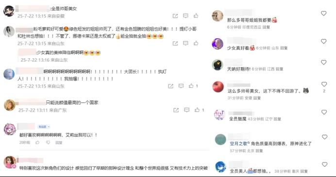 角色方面,“月之少女”哥倫比婭、法爾伽和艾莉絲等多名早期鋪墊角色在短片《月夜的敘事詩》中登場,來自挪德卡萊的全新角色也悉數亮相。在視頻評論區,有大量玩家留言表達對角色外觀設計的喜愛。有玩家認爲,新角色體現了《原神》最擅長的創作風格,不僅和世界觀很搭,同時又展現了技術力上的提升。