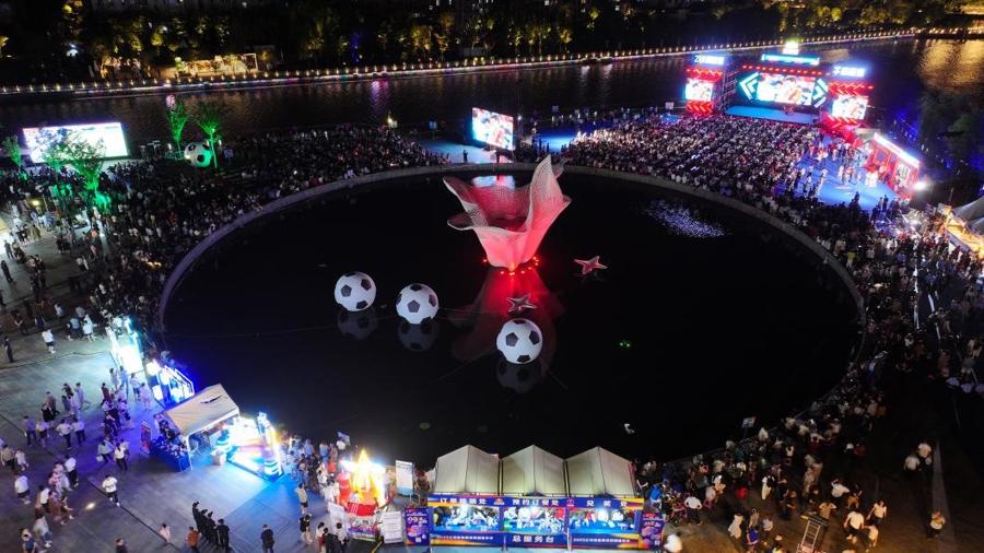 在南通市如東縣,“榜一之戰”的“第二現場”也上演了一番萬人空巷的盛景。7月19日晚8點,如東三河六岸青園咀廣場上,約4000名市民和遊客或站或坐地圍在三處戶外大屏幕前,緊張地觀看着比賽。市民李先生說:“和這麼多人一起看球賽,真是太過癮了!‘蘇超’是今夏最浪漫的賽事。”