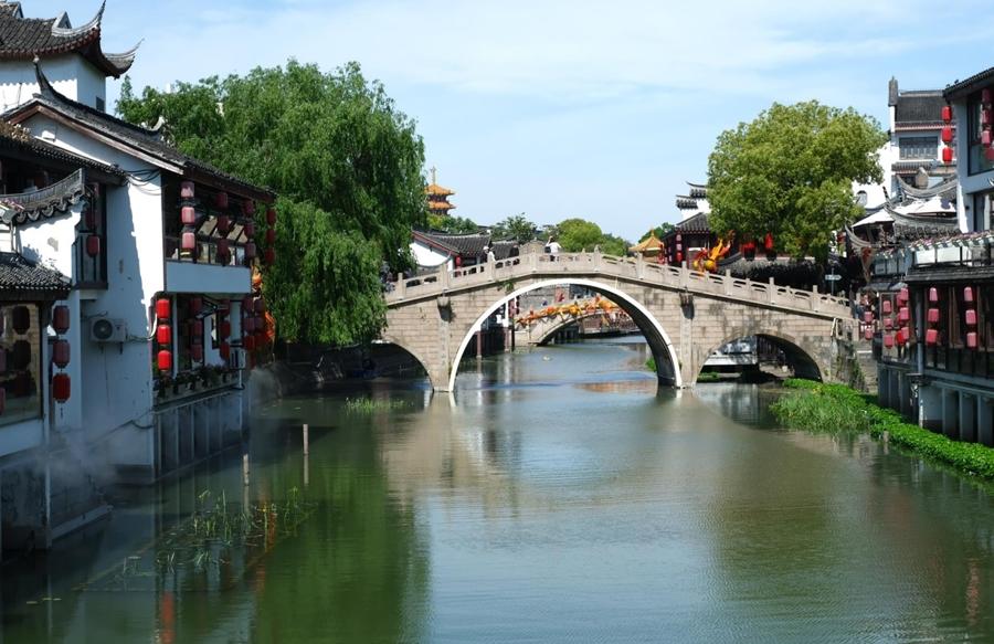 七寶鎮的蒲匯塘橋三跨連拱,與兩岸商鋪、茶館相映成趣,橋身成爲“你站在橋上看風景,看風景的人在樓上看你”的生動舞臺。