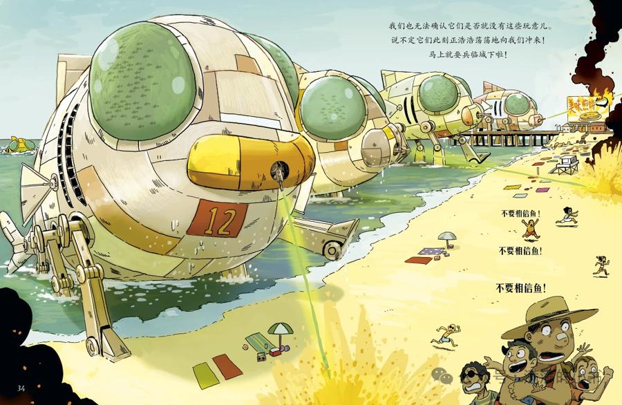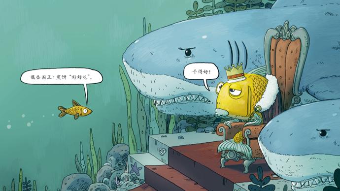 就這樣,不間斷的打趣和荒誕敘述,不僅讓讀者進入了一個信息不對稱的世界,還讓讀者產生了疑慮:是否每個看似“無害”的魚類背後都隱藏着深不可測的危險?這種疑惑感,隨着故事的推進逐漸深化,最終帶領讀者從傳統的兒童讀物跳躍到一種完全出人意料、充滿黑色幽默的科幻冒險。