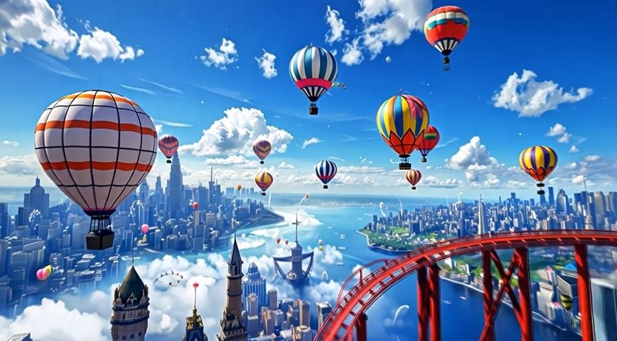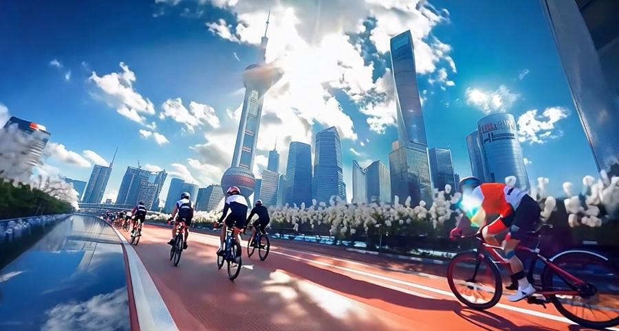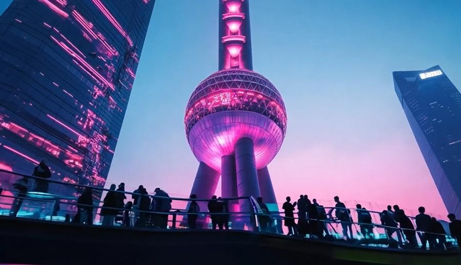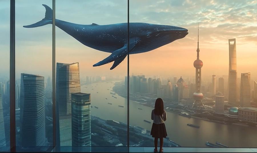 《東方奇幻一日遊》是東方明珠建成30週年之際,陳偉興利用AIGC製作的創意短視頻。鏡頭中,鯨魚愜意地遊過黃浦江上空,陸家嘴賽變身博朋克風格的遊戲界面,遊客們乘坐過山車與東方明珠擦肩而過……談及創作構思,陳偉興直言,AI生成的鏡頭略帶魔幻色彩,很符合自己眼中充滿活力的上海形象。