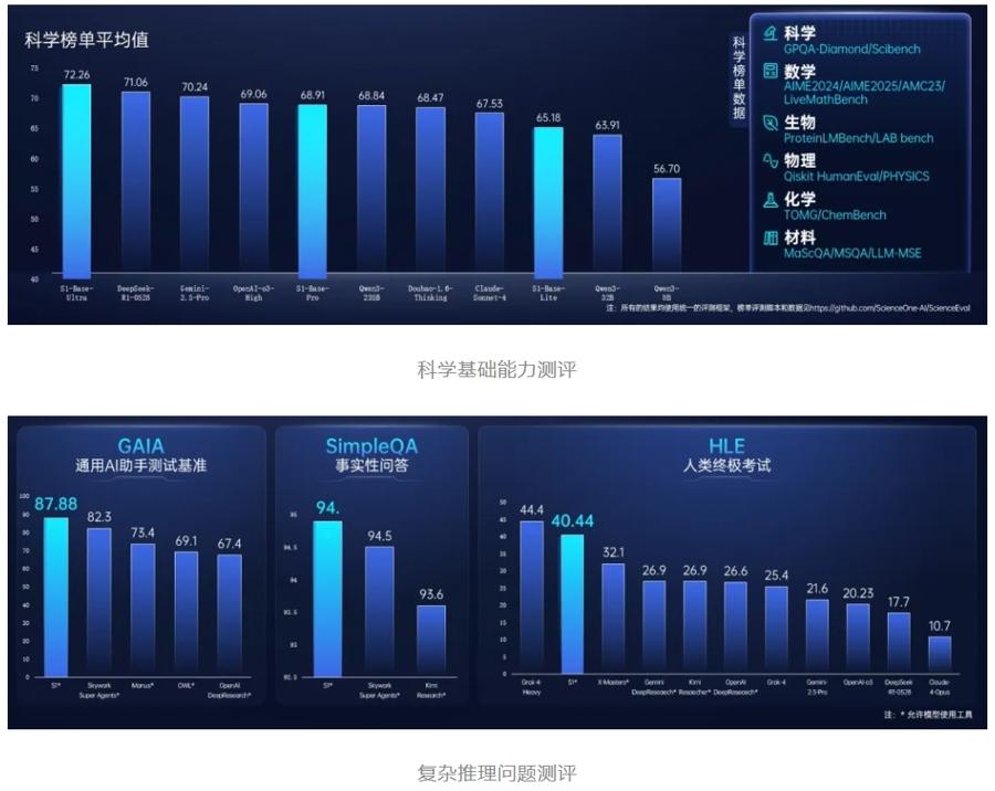具體測評中,在基礎學科領域國際通用的數據集裏,該模型達到數學、物理、化學、材料、生物各學科門類當前最佳性能;在通用人工智能助手測試基準(GAIA)、事實性問答數據集(SimpleQA)等國際權威測試中,展示了領先的科學專業工具調用和科學推理性能;在人類終極考試(HLE)中取得了優秀成績。