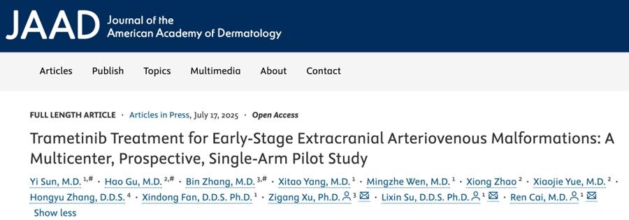 九院介入科範新東團隊在2020年予以曲美替尼治療動靜脈畸形項目立項,建立顱外動靜脈畸形患者隊列,2020-2022年使用皮膚鏡診斷方法,建立算法預測,從紅胎記中篩查早期動靜脈畸形,使得早期動靜脈畸形診斷時間窗提前。相關成果於2022年皮膚科頂刊JAAD發表。