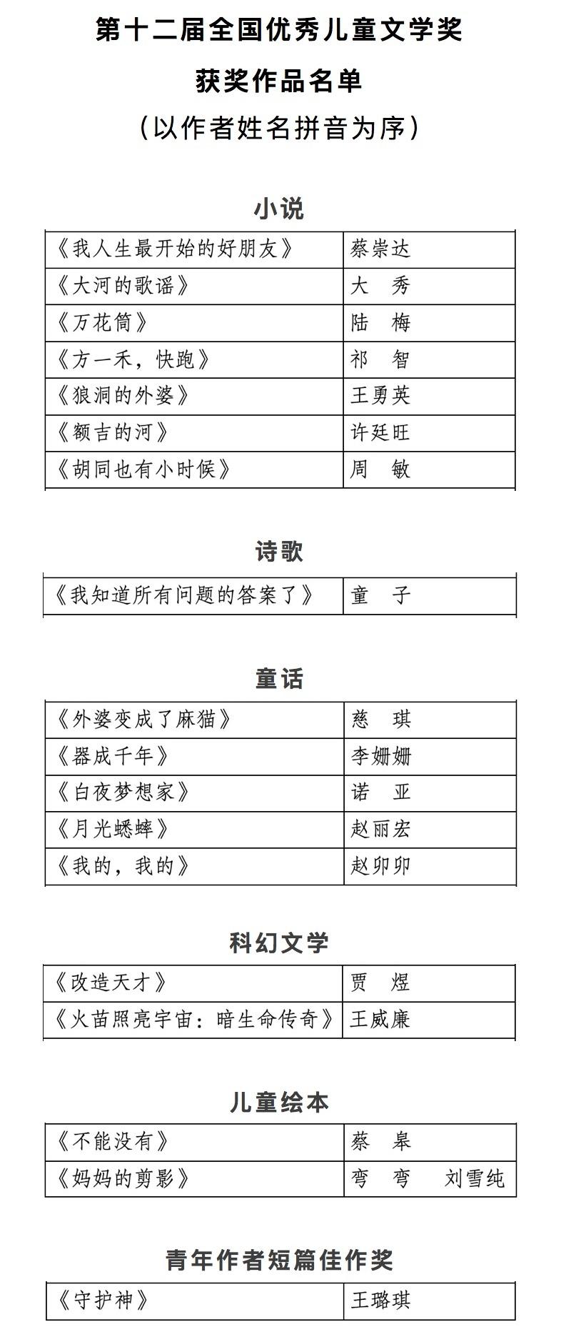 ▷第十二屆全國優秀兒童文學獎揭曉。18部(篇)作品獲獎。其中,小說7部;詩歌1部;童話5部;科幻文學2部;兒童繪本2部;青年作者短篇佳作獎1篇。“2025中國文學盛典·兒童文學獎之夜”將於今年11月在湖南長沙舉行。