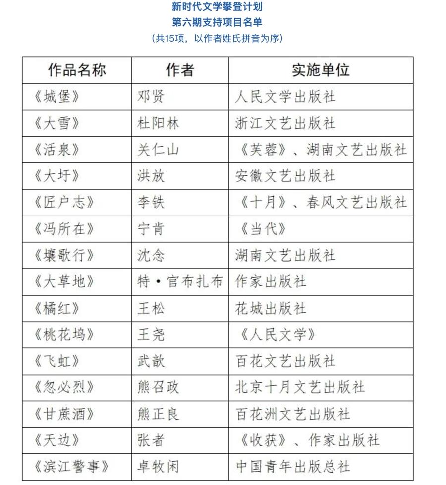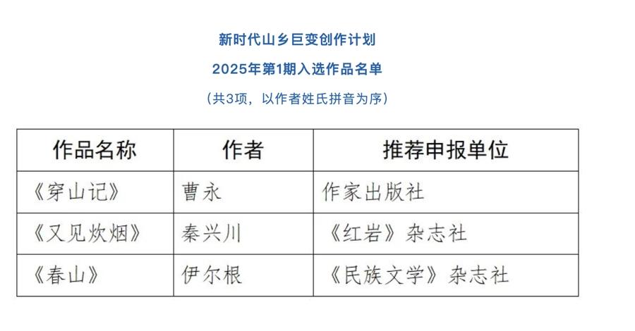 ▷中國作協發佈“新時代山鄉鉅變創作劃” “新時代文學攀登計劃”全新入選作品。包含“新時代山鄉鉅變創作計劃”2025年第一期3部入選作品、“新時代文學攀登計劃”第六期15個入選項目。