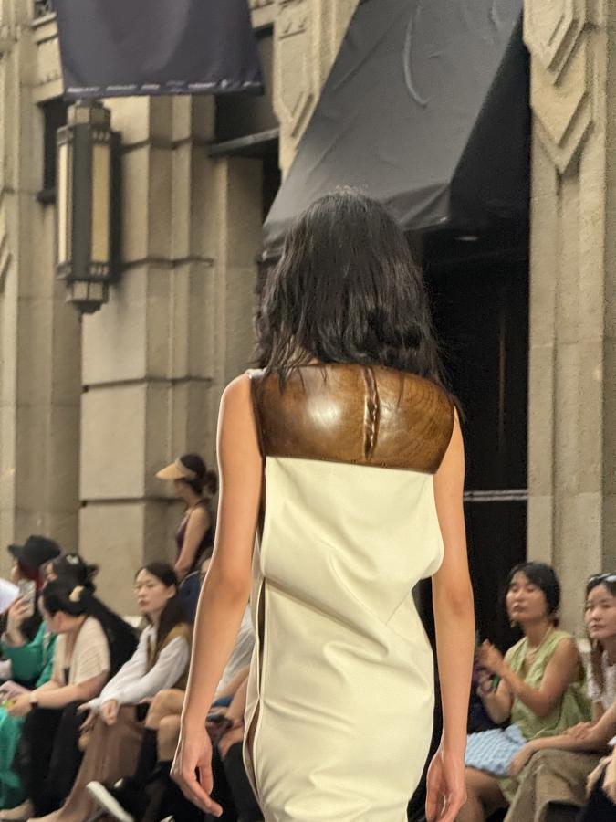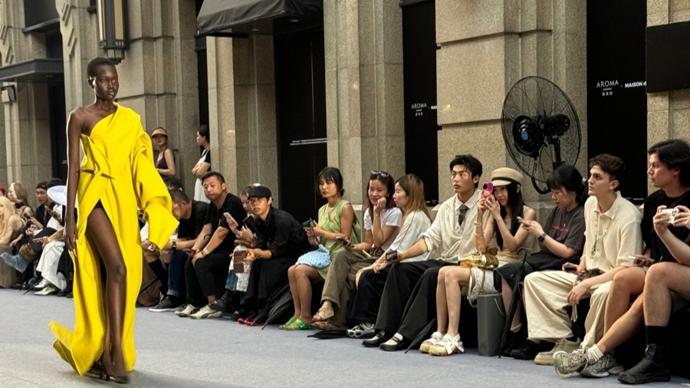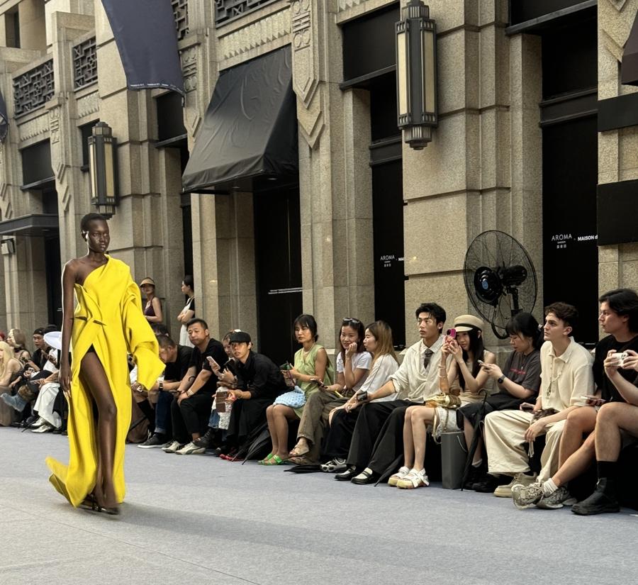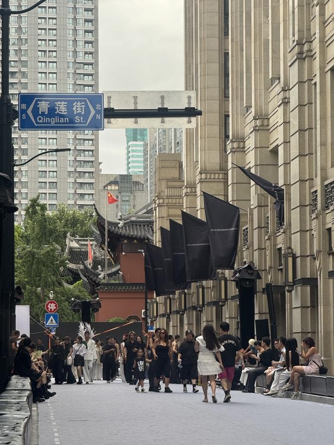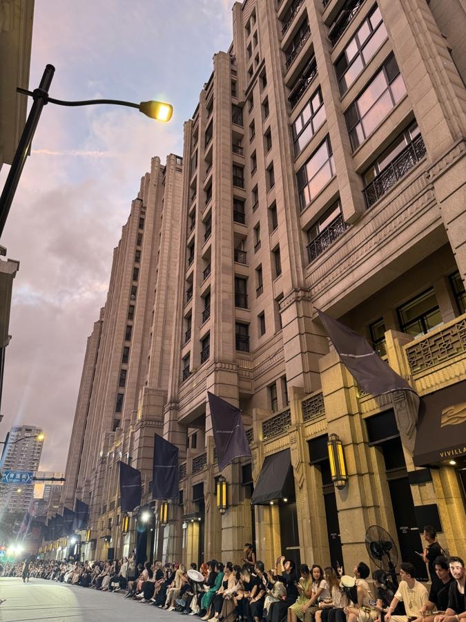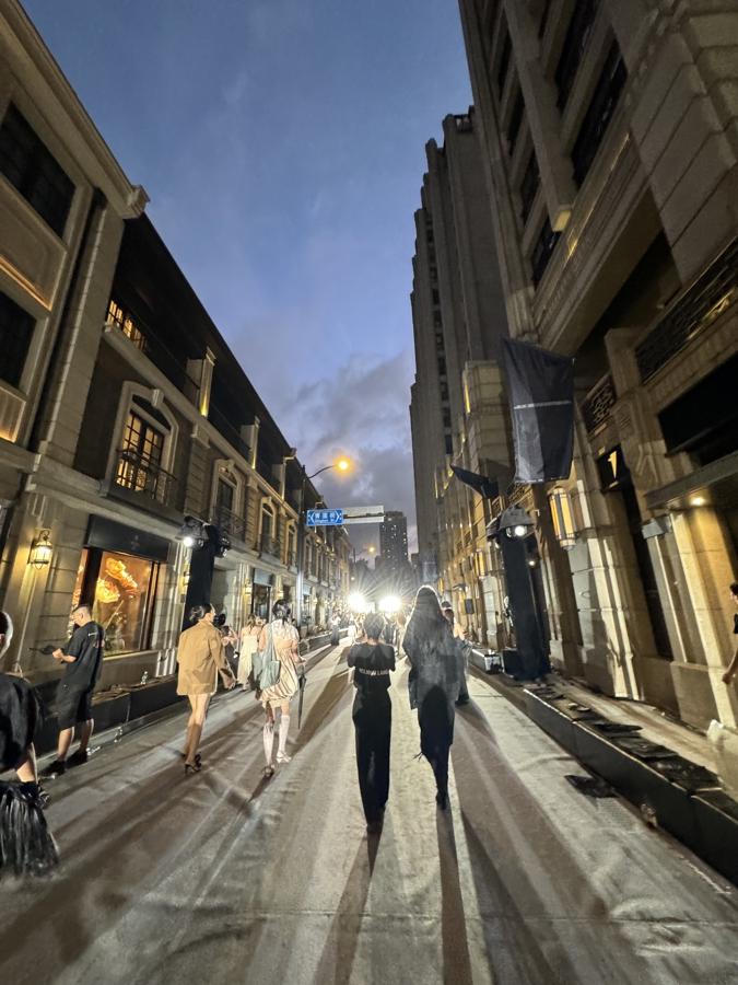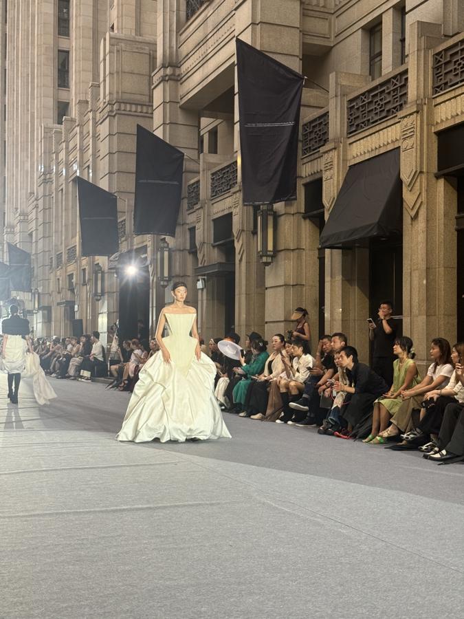 記者在現場看到,毗鄰豫園的露香園大境路街景構建出天然秀場,一側是Art Deco風格建築勾勒的摩登天際線,另一側則是海派風貌歷史保護區的活態樣本,當模特身着融合傳統工藝與現代解構的華服穿行其間,Art Deco的簡潔線條與海派建築的繁複雕花在秀場兩側形成天然的視覺對話,海派風情的溫婉靈動與騰格里大漠的雄渾壯闊在此交織碰撞,形成了奇妙的張力場。