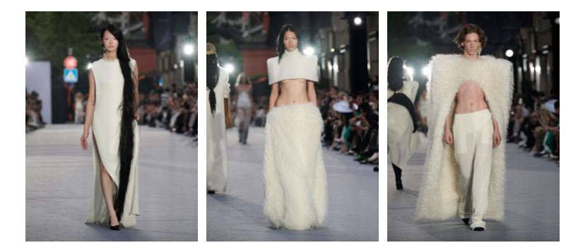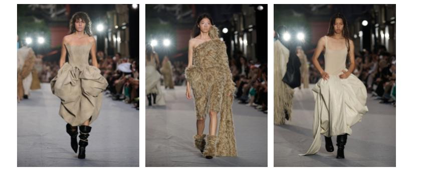 其中,馬蹄袖駝峯禮服中倏忽劃出的曲線廓形猶如蒙古山嶽靜默的體態;皮紝遊牧斗篷間上萬顆手工鑲嵌的白水晶,輪轉草原旅人鬢間如水的月光;巴爾虎廓形卷裙厚重而綿密,羊毛層疊的褶皺中溫存神聖敖包的溫度。其意欲展陳原生態的部落影像,既折射着孩提時代的純真回憶,亦散落着未經裁切的信仰碎片。