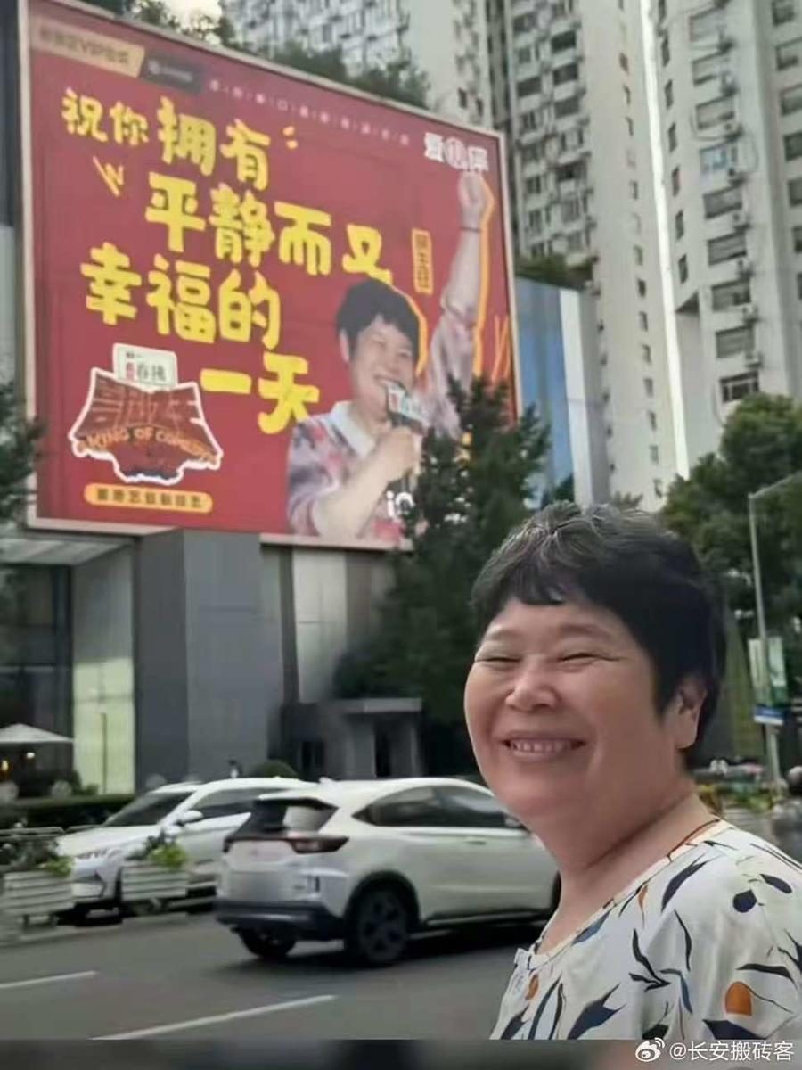 近日,脫口秀女演員“房主任”在上海“上牆”了。巨幅海報上,“房主任”右手持話筒,左手振臂高呼:“祝你擁有平靜而又幸福的一天。”