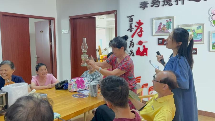 22位長者圍坐一堂,8件跨越半個世紀的生活老夥伴在桌上依次排開:鋁飯盒、老式臺式鍾、鋁殼熱水瓶、黑白電視機、撥號電話機、收音機、撥號電話機、搪瓷杯子、煤油燈,一段旋律、一聲“咔噠”,記憶閘門瞬間被推開。