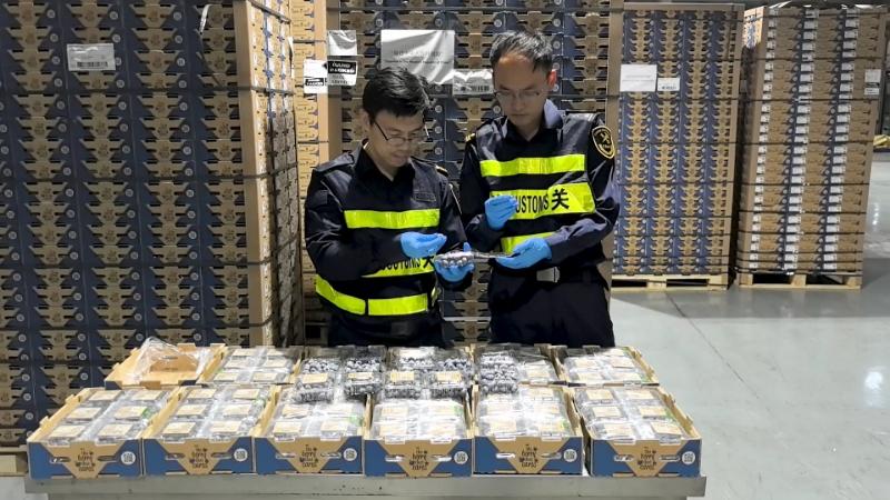 上海海關關員對祕魯進口藍莓開展查驗。 謝宗贏 攝