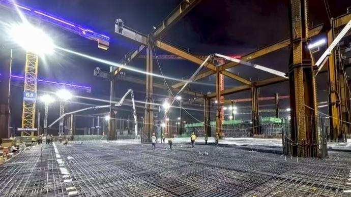 南京北站是滬渝蓉高鐵的重要樞紐客站,建築總面積約69.21萬平方米,分地上四層、地下兩層共六層建設。其中,地上四層分別爲地面層、出站層、承軌層、高架層。此次完成澆築的是出站層B2-6流水段,面積約2692平方米,混凝土澆築量達1400立方米。該層整體採用“跳倉法”施工工藝,共劃分25個流水段,此次首段頂板澆築的完成標誌着這一施工工藝的順利啓動。