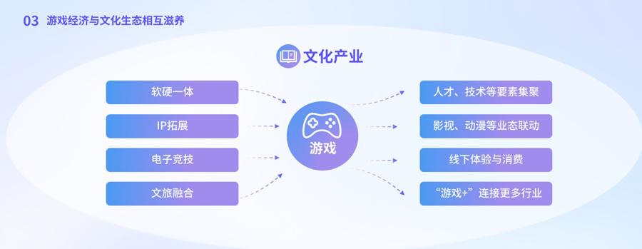 遊戲產業一方面深深紮根於文化與科技融合的沃土,爲自身的長青發展汲取養分;另一方面,遊戲在文化產業生態中爲文學、音樂、影視、旅遊等板塊貢獻要素,發展融合業態,反哺文化產業;同時,遊戲化思維的牽引力、遊戲科技的創新力,以及遊戲對文化、知識的獨特表達與表現,正不斷向更廣泛的外部領域溢出,促進文化與教育、醫療、工業等行業的深度融合,創造出更多增量價值。