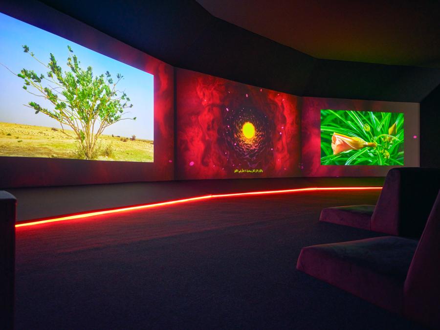 沙漠,不僅是地理符號,更是沙特民族精神的隱喻。藝術家們以沙爲媒,探討生命與空間的永恆命題。在一個名爲《沙漠守護者》的多通道視頻裝置藝術中,一株株珍貴的沙漠植物正在生長,藝術家圍繞“誰是記憶的守護者”“從何處追溯起源並洞見未來”等問題,聚焦沙漠中通過“水平基因轉移”確保後代延續的寄生物種,它們承載沙漠歷史與可持續未來線索;裝置以詩意敘事,重新詮釋氣候變化、生物多樣性喪失及海灣地區的未來。