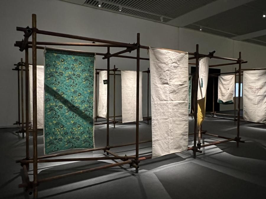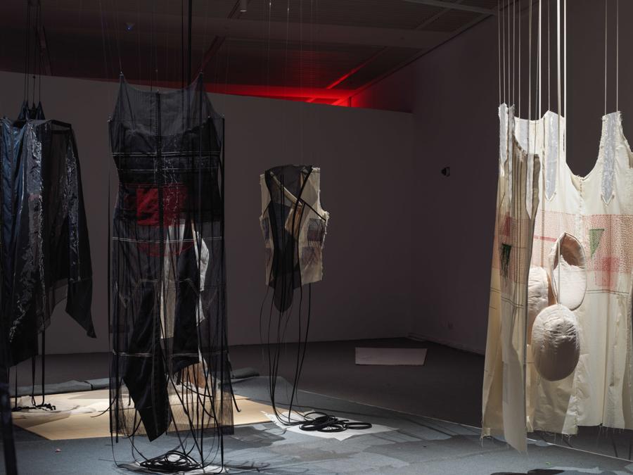 文化傳統,則是創作的根系。展廳中,一個名爲《五個女人》的紡織裝置藝術,以解構的沙特女性舊衣爲材,通過剪裁、重組服飾結構與圖案,探討記憶、轉變與身份。衣物成爲身體的延伸與生命敘事的容器,隱喻原主人的個性、成長與創傷。藝術家以實驗性手法重塑服裝元素,形成脆弱通透的“新身體”,象徵在蛻變中剝離舊殼、獲得新生的過程。