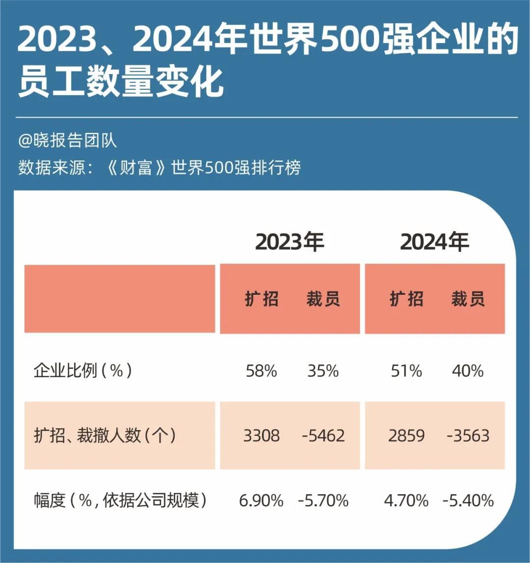 與此同時,宣佈裁員的500強企業卻在不斷增加。2023年有35%的企業在財報中提到裁員,2024年上升到40%。在這兩年裏,這些企業的裁員比例都在5%以上。