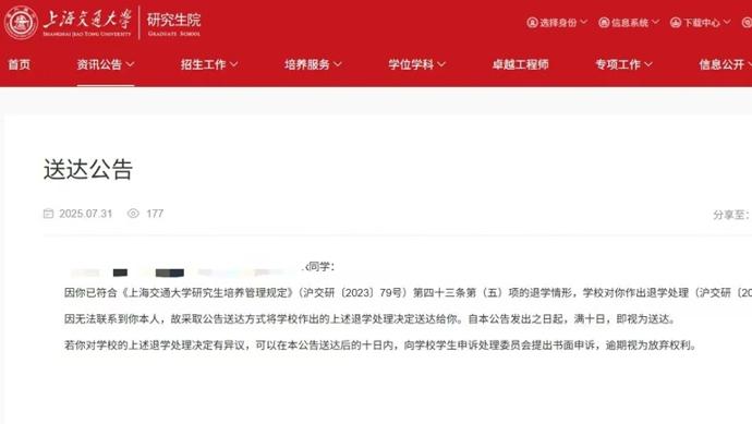 六條送達公告表示,“因你已符合《上海交通大學研究生培養管理規定》(滬交研〔2023〕79號)第四十三條第(五)項的退學情形,學校對你作出退學處理。因無法聯繫到你本人,故採取公告送達方式將學校作出的上述退學處理決定送達給你。自本公告發出之日起,滿十日,即視爲送達。若你對學校的上述退學處理決定有異議,可以在本公告送達後的十日內,向學校學生申訴處理委員會提出書面申訴,逾期視爲放棄權利。”