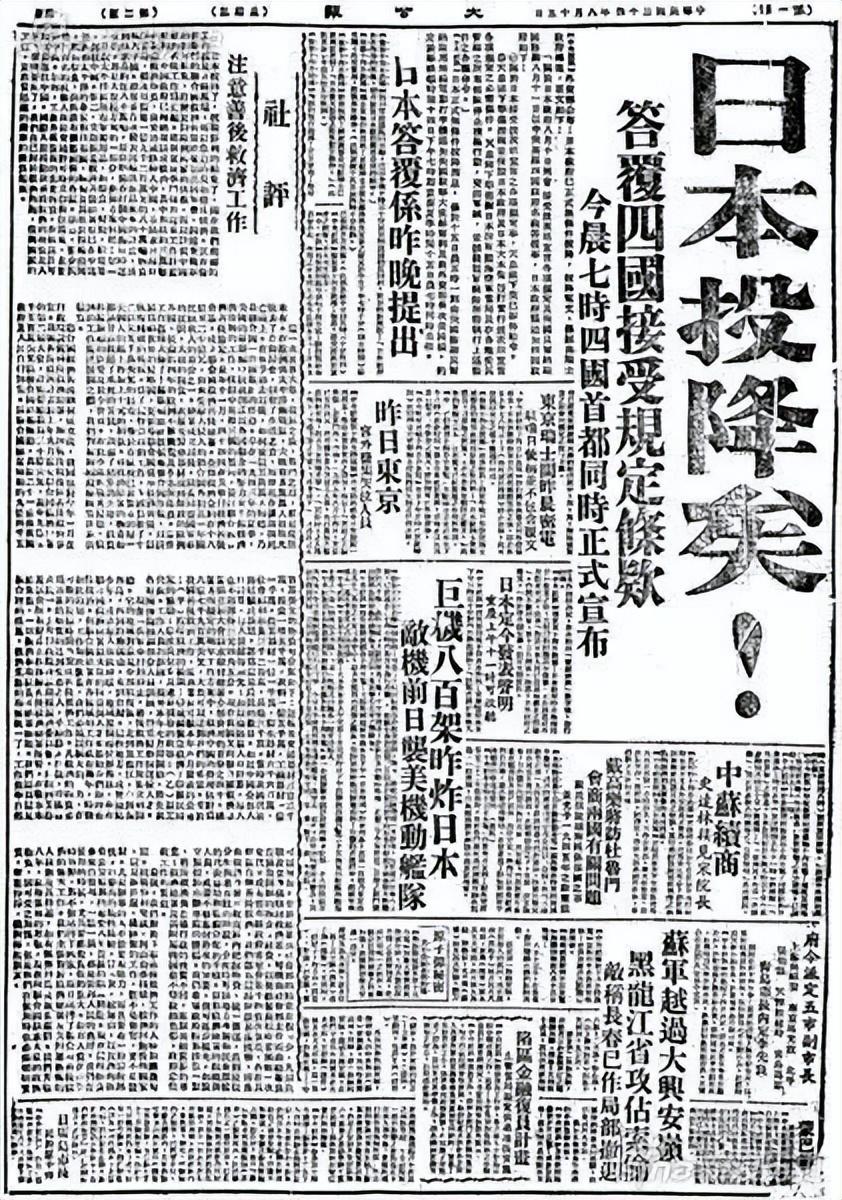 1945年8月15日,日本宣佈無條件投降,《大公報》使用了前所未有的超大字號發佈這力透紙背的5個字,號外一經發出就被民衆搶購一空,人們奔走相告,萬人空巷。