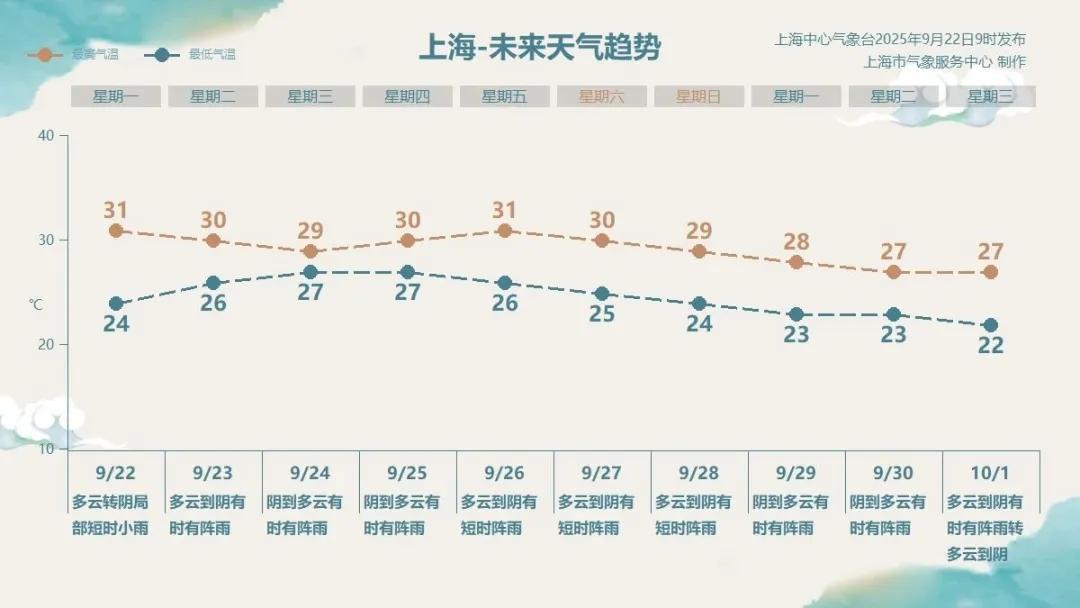 上海中心氣象臺預計,本週工作日在臺風外圍環流和弱冷空氣先後影響下,上海天空雲系較多,且不時有陣雨出現,其中週三白天的降水最爲明顯。此類降水隨機“任性”且空氣溼度較大,雨具需常備。
