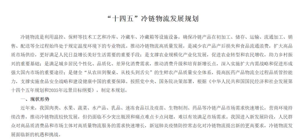 2021年5月官方出臺《“十四五”冷鏈物流發展規劃》,意圖構建銜接產銷、覆蓋城鄉、聯通國內外的冷鏈網絡,逐步形成“官方搭臺、企業唱戲、科技助力、農戶受益”的良性循環。