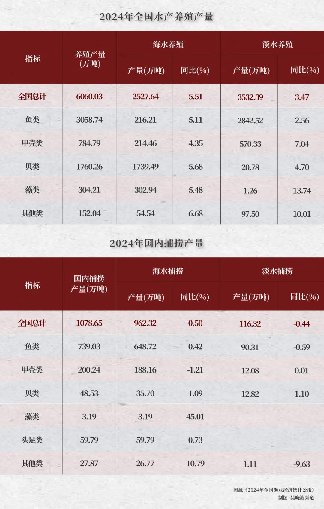 如今的中國,在農耕文明底色之上,還是超級水產品大國。我們擁有約1.8萬公里大陸海岸線和1.4萬多公里島嶼海岸線,海洋資源豐富。過去36年,我國海洋水產品總產量持續位列全球第一,2024年我國海水產品產量超3700萬噸,達到700多億斤。