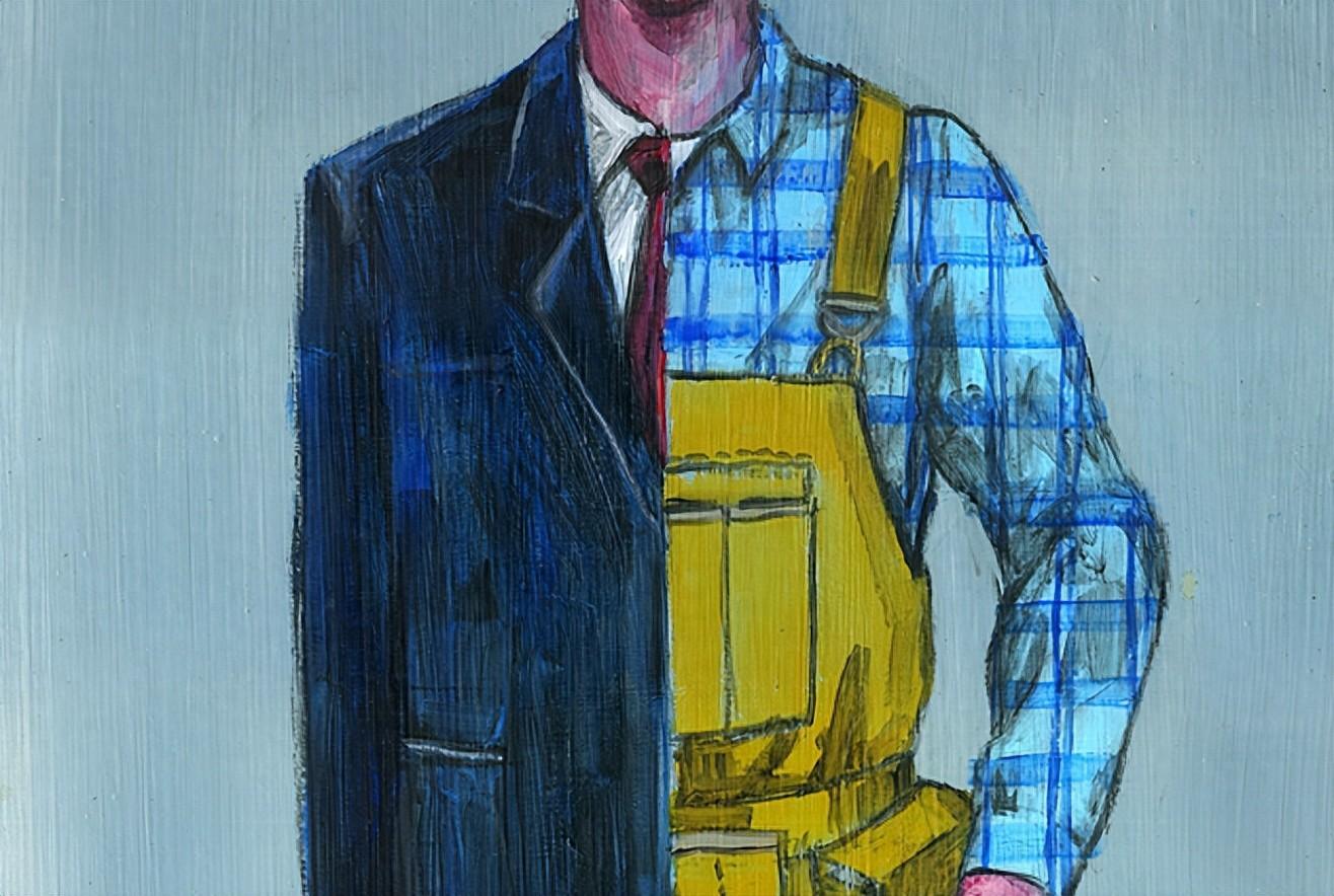 他戴着無框眼鏡,穿着藍色工服,左手裝模作樣打電話,右手把電話筒當成“雙節棍”,身體語言極具攻擊性,似乎要跳脫出高飽和度的黃藍色背景廣告牌。