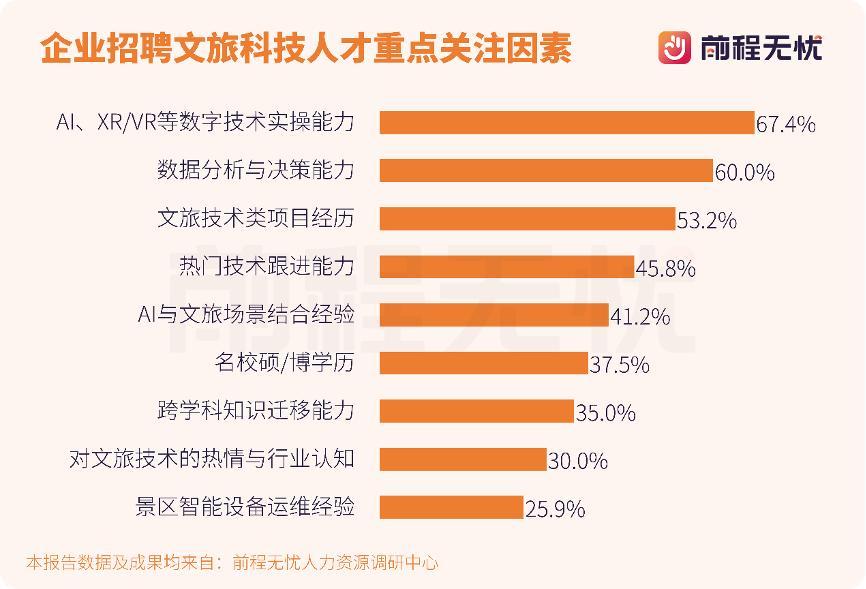 科技創新正成爲文旅產業升級的核心驅動力,也重塑了人才招聘的核心指標,技術能力已從“加分項”變爲“必備項”。前程無憂人力資源調研中心研究成果顯示,頭部企業在招聘中對於候選人對數字工具運用及場景落地能力日益重視,將AI、XR/VR等數字技術實操能力(67.4%)、數據分析與決策能力(60.0%)、文旅技術類項目經驗(53.2%)等納入核心考覈指標。